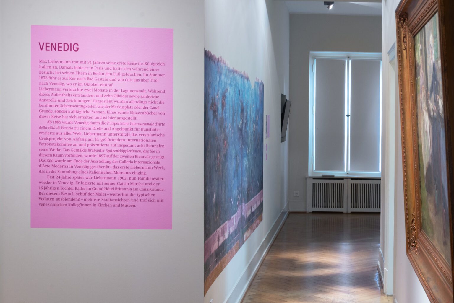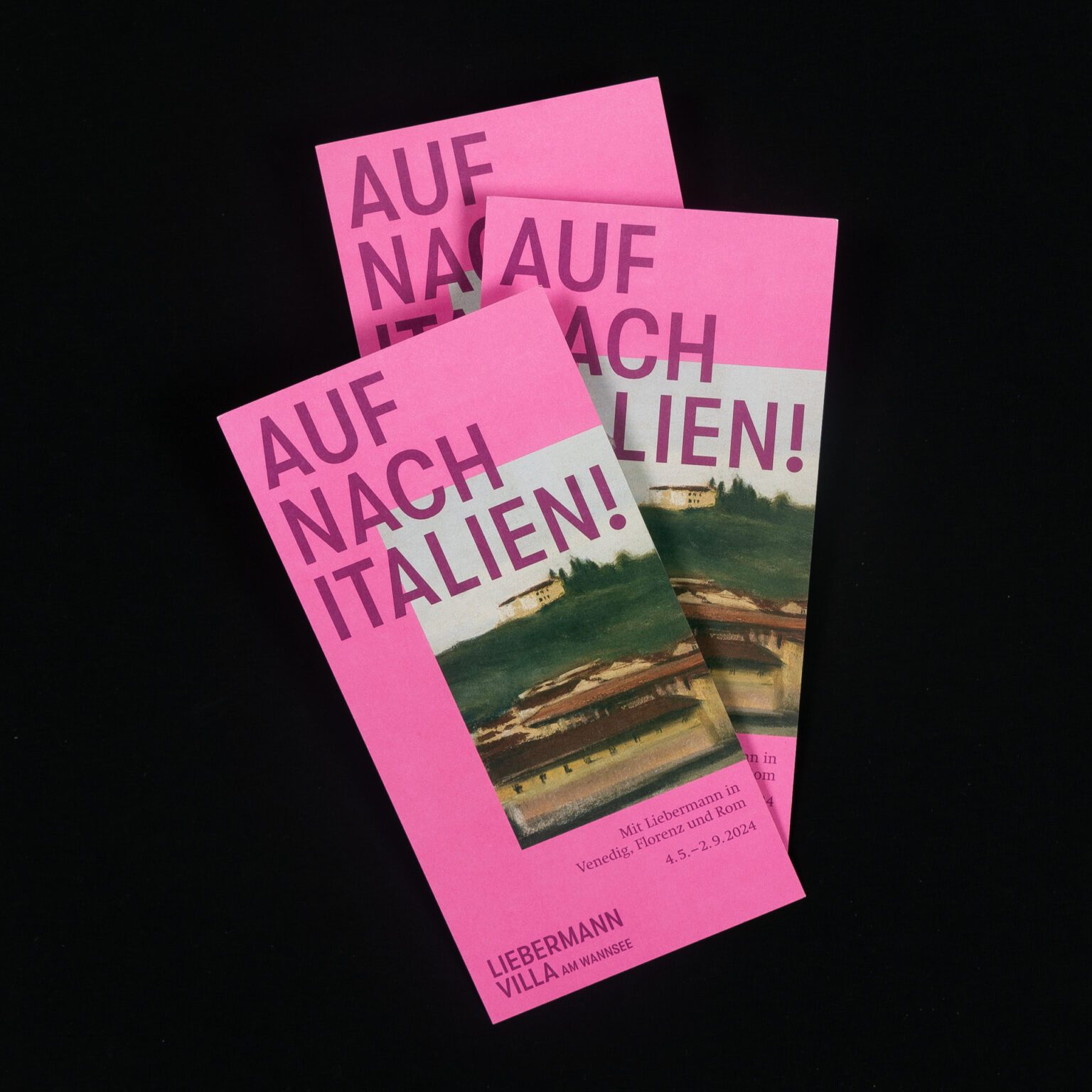 Visuelle Prägnanz durch ein leuchtendes Pink, die Liebermanns Italienreisen flankieren. Zudem schafft die klare Typografie des Ausstellungsdesign ein modernes und lebendiges Gesamtbild.