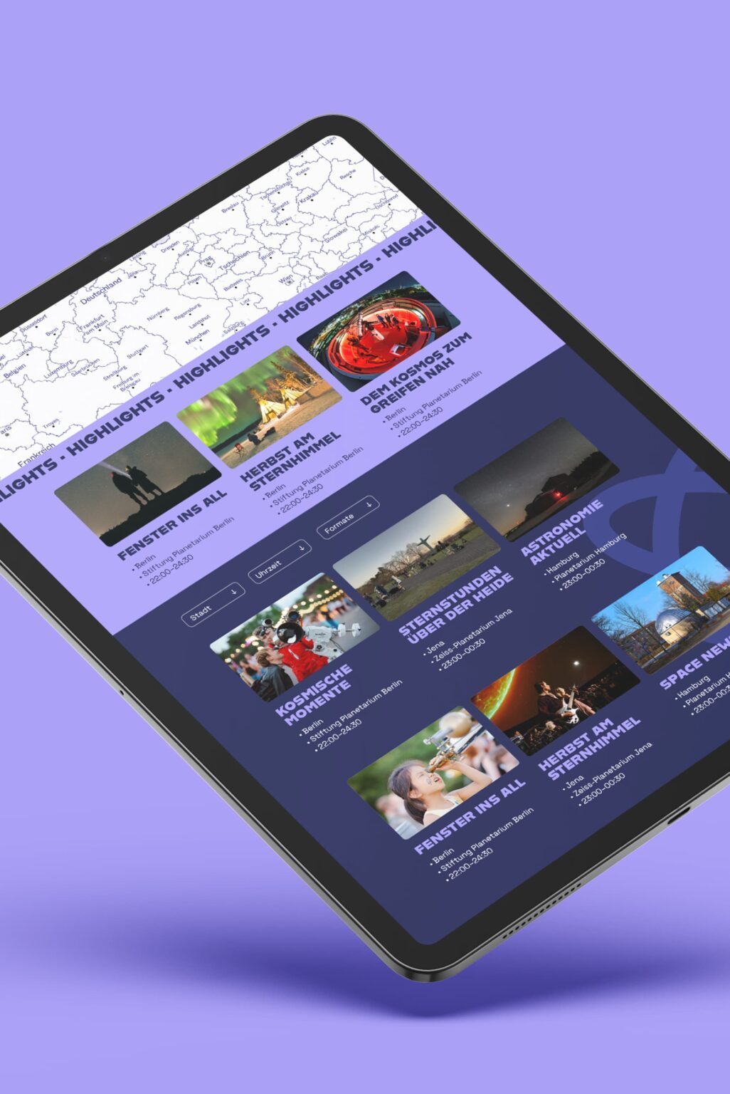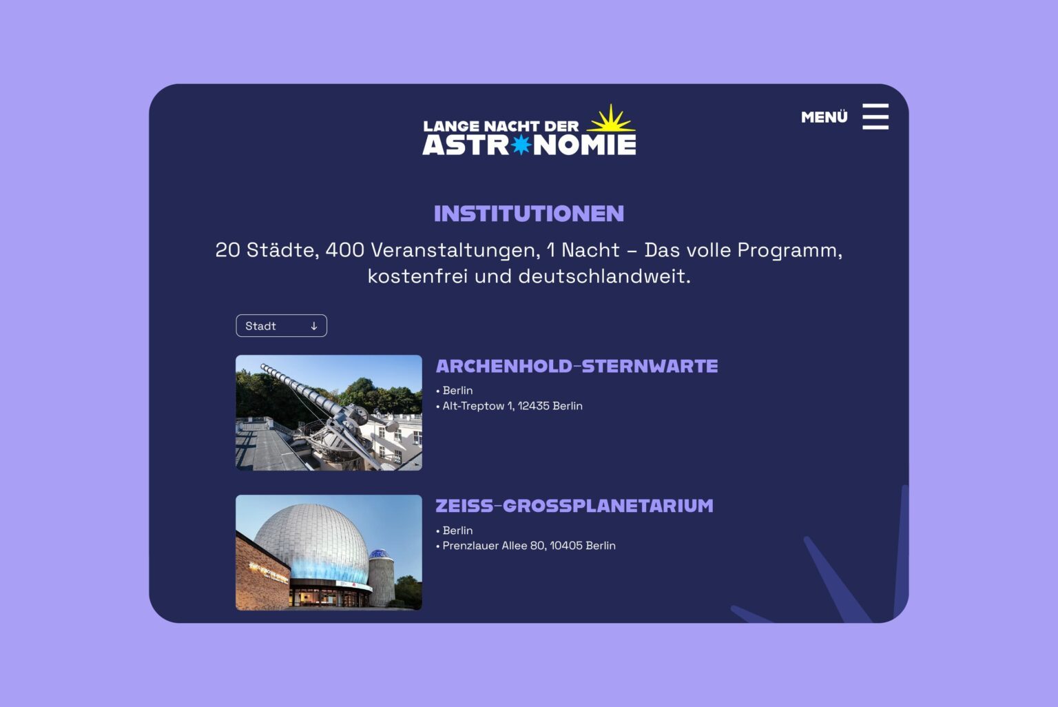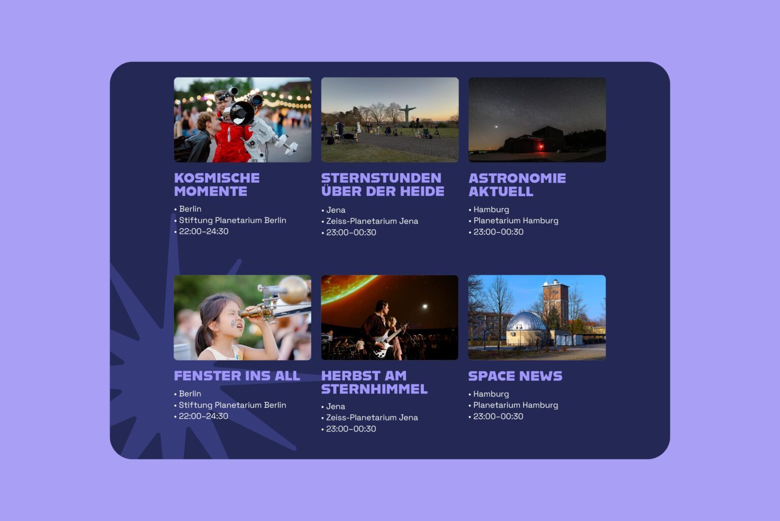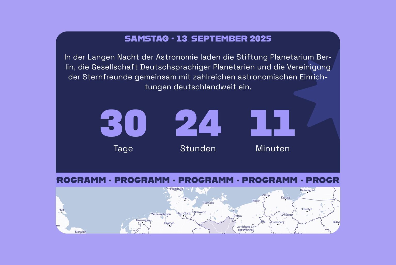 Als langjährige Leadagentur der Stiftung Planetarium Berlin hat Ta-Trung das Erscheinungsbild für die Lange Nacht der Astronomie in Berlin entwickelt und für analoge und digitale Kommunikationsassets umgesetzt. Dabei wurde auf eine hohe Wiedererkennbarkeit des Designs für das jährlich stattfindende Event sowie auf eine breitgefächerte Zielgruppenansprache Wert gelegt.